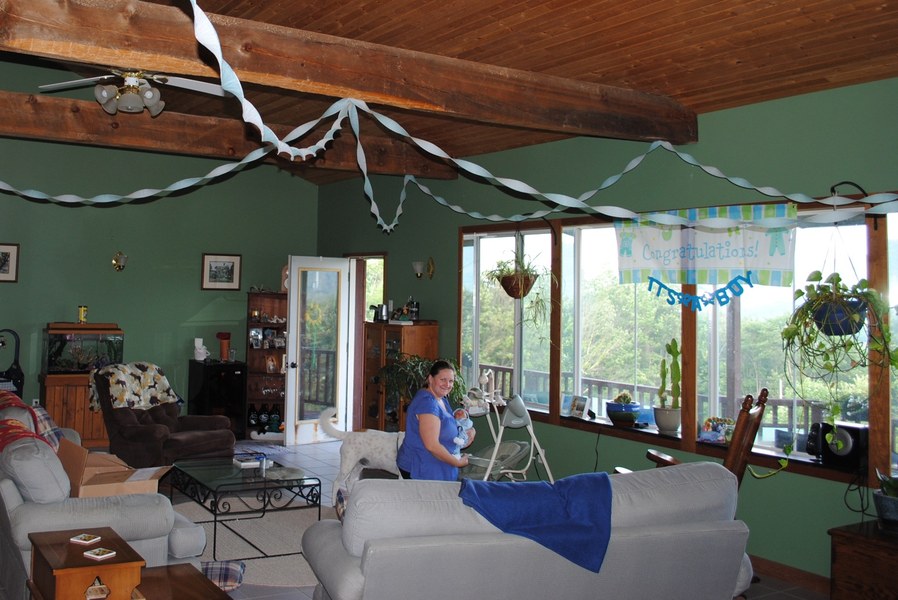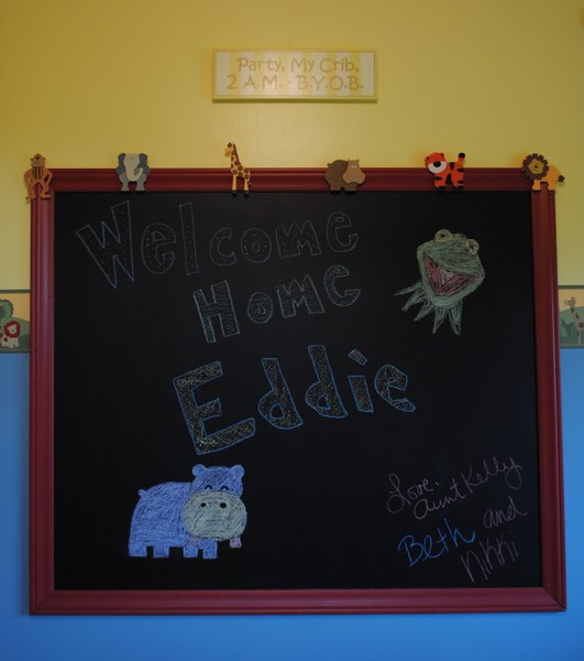 Coming home and getting a bath. Kelly and the girls decorated the living room and wrote a nice note on the blackboard. Eddie isn't particularly fond of being bathed, but he LOVES having his hair washed. Wyatt and Pepper love him, and are very gentle. Wyatt almost never leaves the baby's side. We're calling him the 'nanny'!